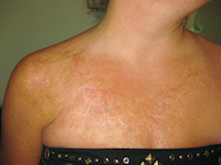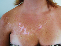 Following breast cancer surgery or breast implants/reduction recreation of an areola can be done with “3-demensional nipple” look. To improve the appearance of post-surgical scarring around the circumference of the areola custom matched pigments are infused through the areola outward into the scar tissue to camouflage the scars.